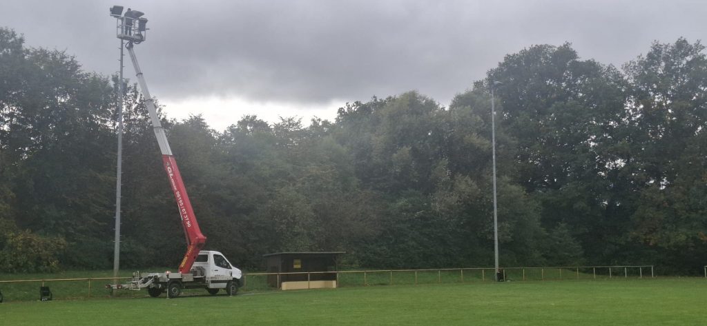 Nach einem langen Antrags- und Bewilligungsprozess war es am 09. Oktober 2025 endlich soweit – unsere 25 Jahre alte Flutlichtanlage auf Platz 2 wurde erfolgreich auf moderne LED-Technik umgerüstet!